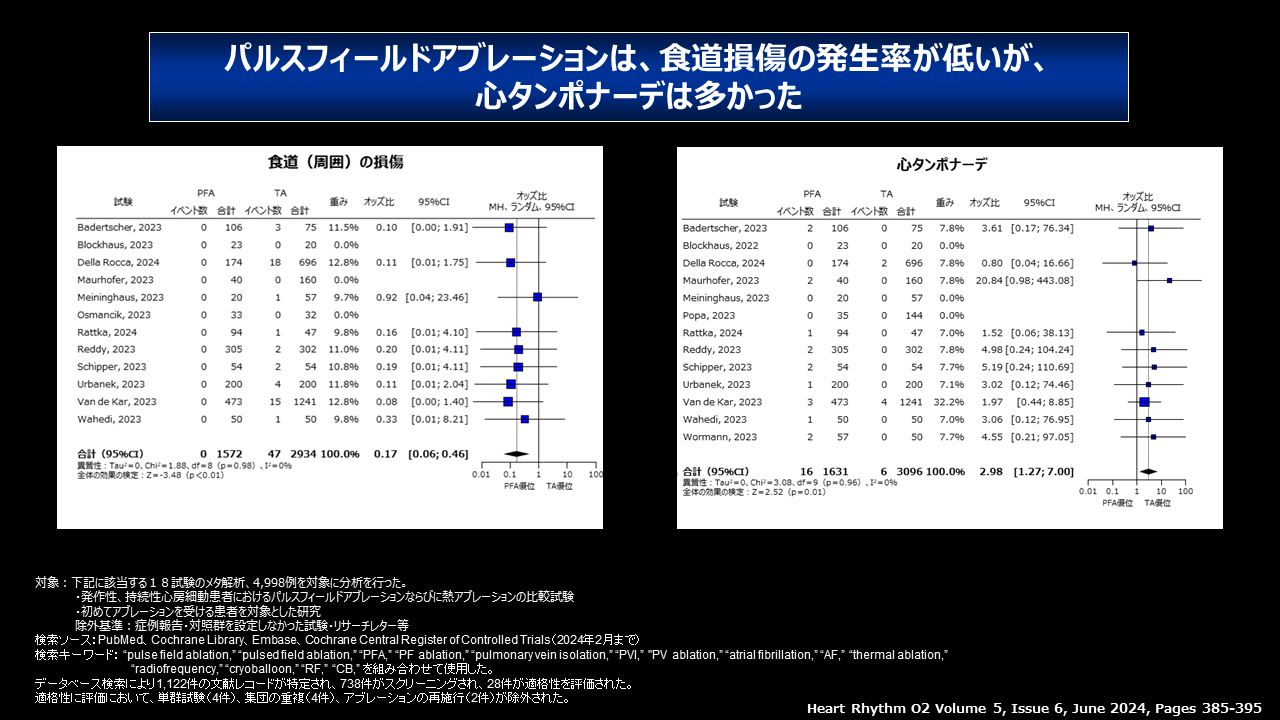 - また、パルスフィールドアブレーションでは、食道損傷の発生率低下と心タンポナーデの発生率増加がみられた