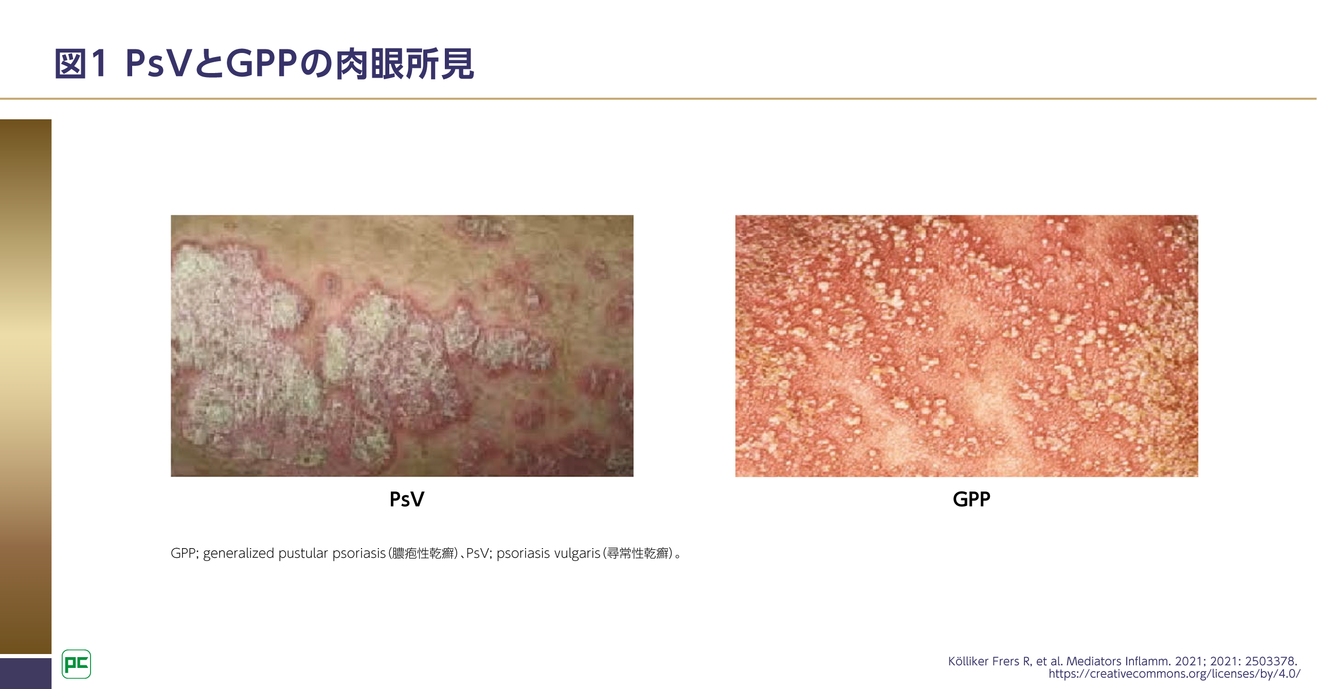 膿疱性乾癬(GPP)は、急激な発熱、倦怠感、浮腫といった全身症状とともに全身の皮膚が潮紅し、無菌性膿疱が多発する疾患です。GPPは希少な疾患であることから、現実的な治療などは尋常性乾癬(PsV)に準じてきました。しかし、全身症状の有無、皮膚病変の現れ方、遺伝的背景、発症メカニズムの違いなどから、GPPはPsVとは異なる疾患であり、必要とされる患者ケアも異なると考えられるようになってきています1)。また、GPPは膿疱を特徴とする全身性疾患であり、急性症状に対して適切な初期治療がなされなかった場合、心不全や腎不全、敗血症などを引き起こし致死的な状態に進行することもあります。