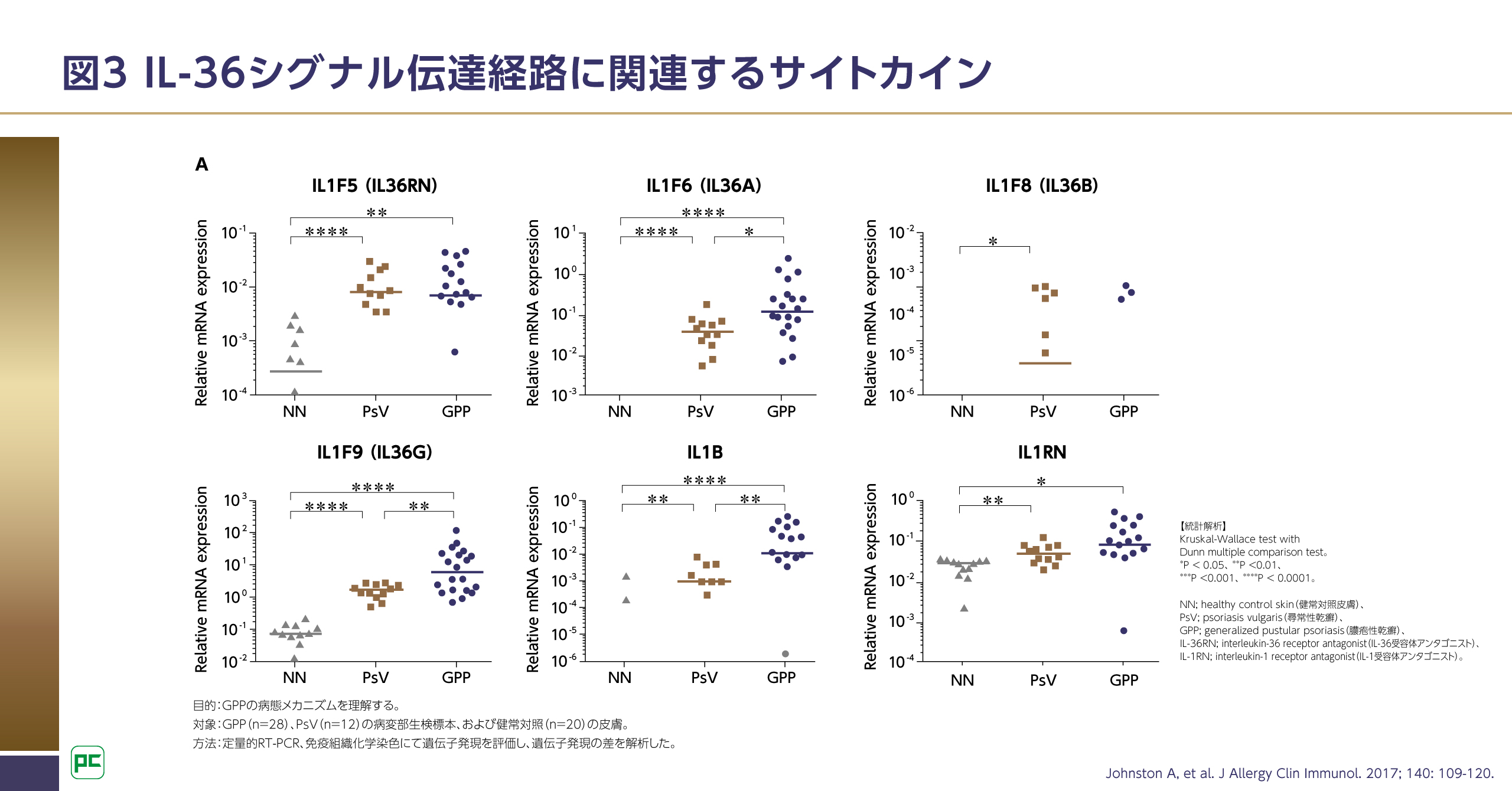 GPP、PsVの皮膚病変および健常者の皮膚組織を用いて遺伝子発現を検証した研究では、GPPは、PsVに比べて、IL-36シグナル伝達経路に関連するIL-1β、IL-36の発現レベルは高く、一方でIL-17A、IL-22、IL-23、IFNγ、IL-18などの発現レベルは低かったことが報告されています(図3、図4)5)。