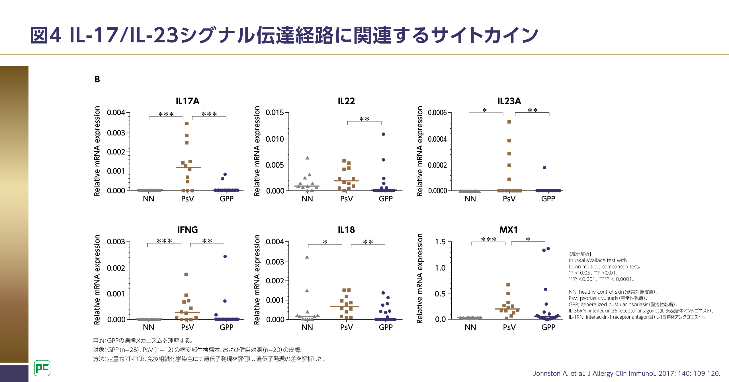 皮膚症状が中心であるPsVと異なり、GPPは膿疱を特徴とする皮膚疾患というだけでなく生命を脅かす全身性疾患で、病理組織学的にも異なる表現型を示します。また、それぞれの病変部皮膚で発現している遺伝子も異なっており、PsVではIL-17/IL-23シグナル伝達経路に関与する獲得免疫系で働くサイトカイン、GPPではIL-36シグナル伝達経路に関与する自然免疫系で働くサイトカインの発現亢進が認められました。