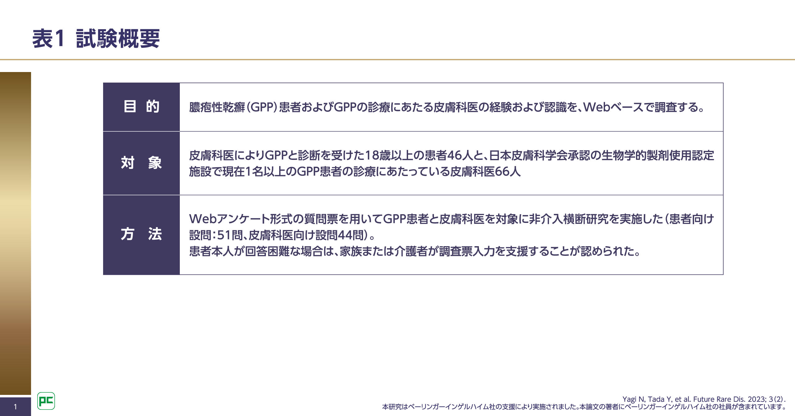 GPPの臨床プロファイルや治療に伴う経済的負担についてはレセプトベースの研究結果が報告されているものの2-4)、患者と医師双方の視点に基づいたGPPの疾病負荷についてはほとんど明らかになっていません。