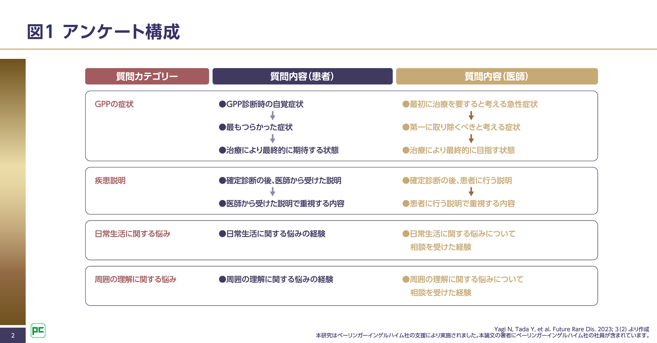 アンケートは、GPPの症状、疾患説明、日常生活、周囲の理解などに関して、患者向け51問、皮膚科医向け44問の構成で実施されました(図1)。