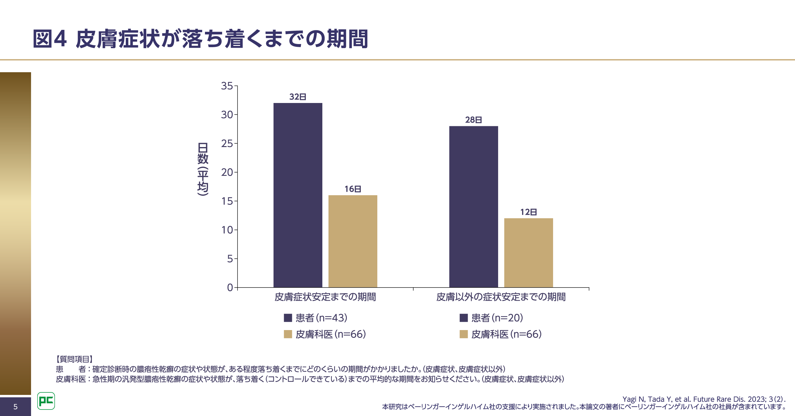 皮膚症状が落ち着くまでの平均日数については、患者は32日と回答したのに対し、医師は16日と回答し、皮膚以外の症状が落ち着くまでの平均日数は患者が28日、医師が12日と回答しました(図4)。