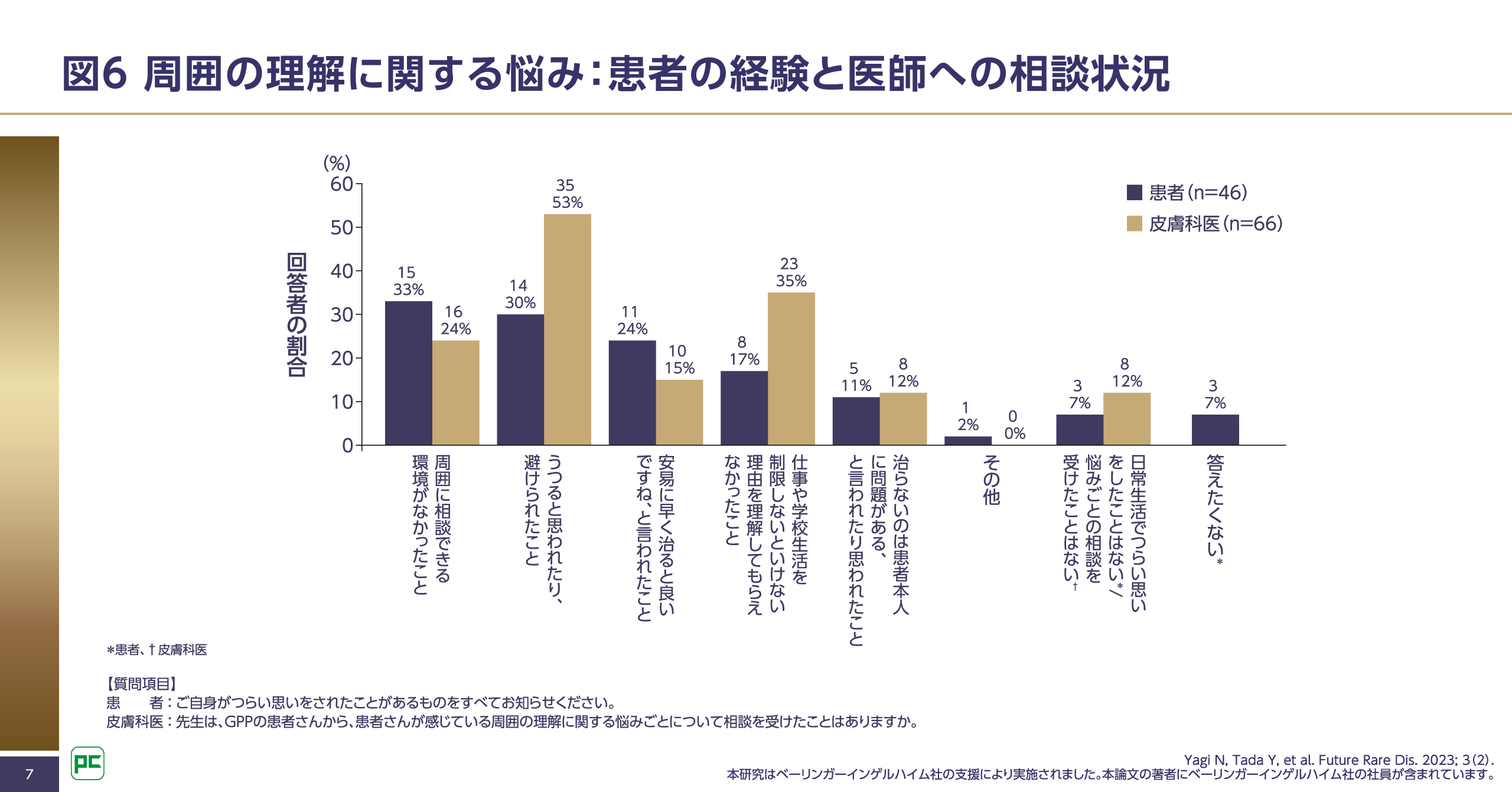 GPPに関連する日常生活への支障を感じたことがないと回答した患者は1名(2%)のみであり、ほとんどすべての患者が日常生活で悩みを抱えていることが明らかとなりました。日常生活においては、対人関係、仕事・学校関係でつらい思いをしたと回答した割合が高く、周囲の理解に関しては、相談できる環境がなかった、うつると思われた、避けられたという経験を訴える回答が多く挙がりました(図5、図6)。