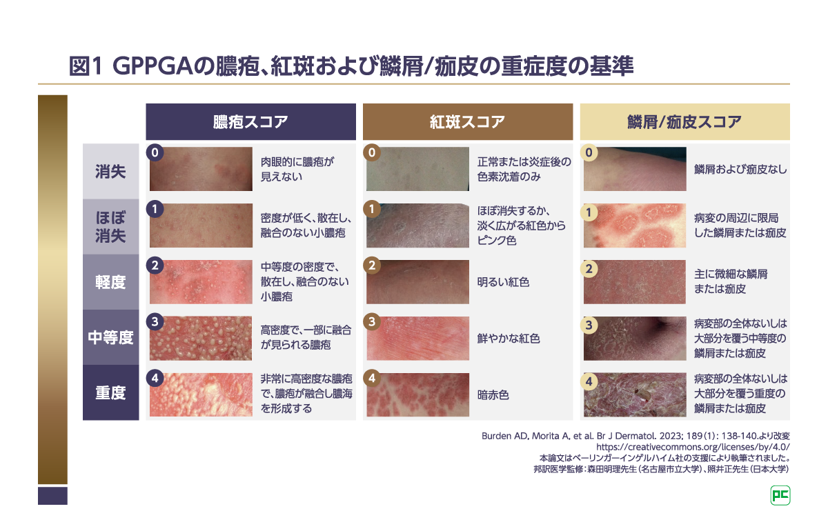[参考]GPPGA(膿疱性乾癬に対する医師による全般的評価[Generalized Pustular Psoriasis Physician Global Assessment])では、すべての病変に対して各構成要素を評価し、各構成要素の重症度は5段階尺度で評価されます(図1)。GPPGA合計スコアは、すべてのGPP病変の膿疱、紅斑、鱗屑/痂皮を0(消失)~4(重度)で評価し、各構成要素のスコア(サブスコア)の平均値[(膿疱サブスコア+紅斑サブスコア+鱗屑/痂皮サブスコア)÷3]から算出します。