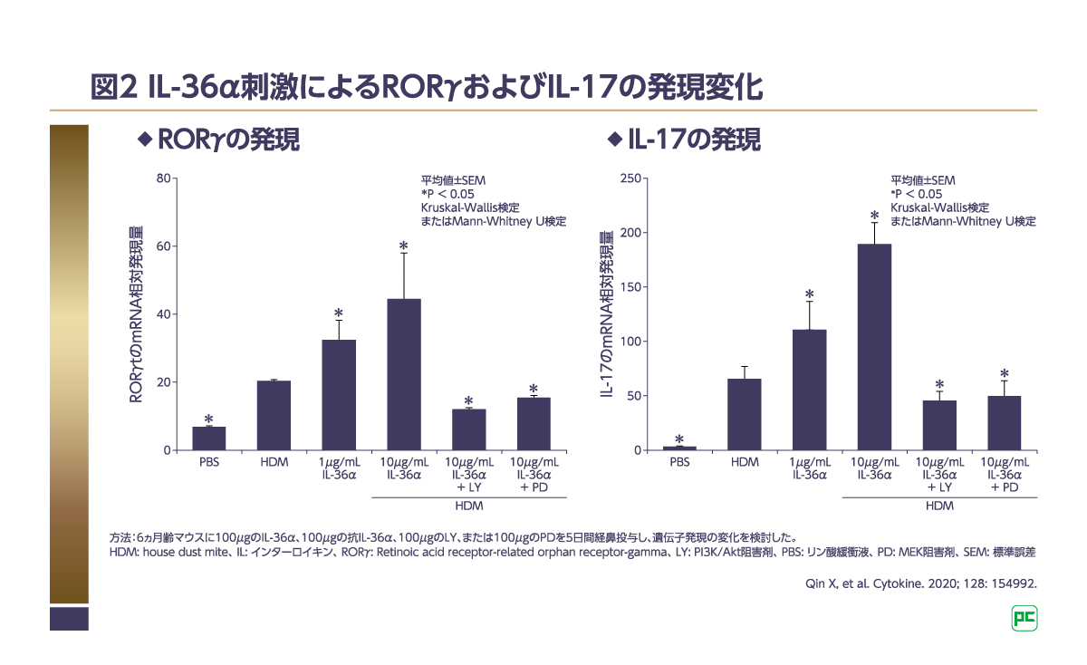 マウスの末梢血単核細胞(peripheral blood mononuclear cell; PBMC)を用いて、IL-36α刺激がTh17細胞に関連する遺伝子発現に及ぼす影響を検討した研究が行われました6)。その結果、IL-36α刺激により、Th17細胞の転写因子であるRORγやIL-17の発現増加が認められました(図2)6)。