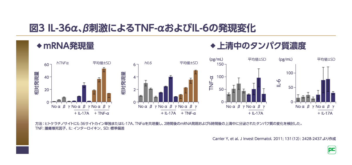 また、ヒトのPBMCを用いて、IL-36α刺激によるTh17細胞に関連する遺伝子の発現変化を検討した研究では、刺激後2時間でTNF-αおよびIL-6のmRNA量が増加し、刺激後6時間でそれぞれのタンパク量が増加していることが示されました7)。さらにIL-17、TNF-α存在下では、TNF-αおよびIL-6の発現増加が認められました(図3)7)。以上の結果から、IL-36によって誘導されたIL-17AおよびTNF-αは、さらなる炎症反応を誘導すると考えられます7)。