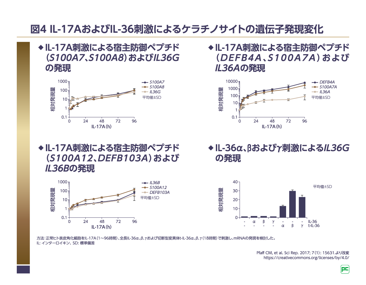 ケラチノサイトはサイトカインなどを介して免疫細胞とクロストークしていることが知られています8)。ヒトケラチノサイトを用いて、IL-17A、IL-36刺激による遺伝子発現の変化を検討した研究が行われました9)。ヒトケラチノサイトをIL-17Aで刺激した結果、IL-36をコードする遺伝子IL36A、IL36B、IL36Gの発現増加が認められました(図4)9)。さらに、IL-36α、β、γ刺激によるIL36Gの発現を検討したところ、活性を示すIL-36α、β、γの切断型変異体を加えたケラチノサイトにおいて、IL36Gの発現増加が認められました(図4)9)。以上の結果から、IL-36はIL-17Aシグナルと協調し、持続的な炎症を促進する増幅メカニズムを有することが示唆されます9)。