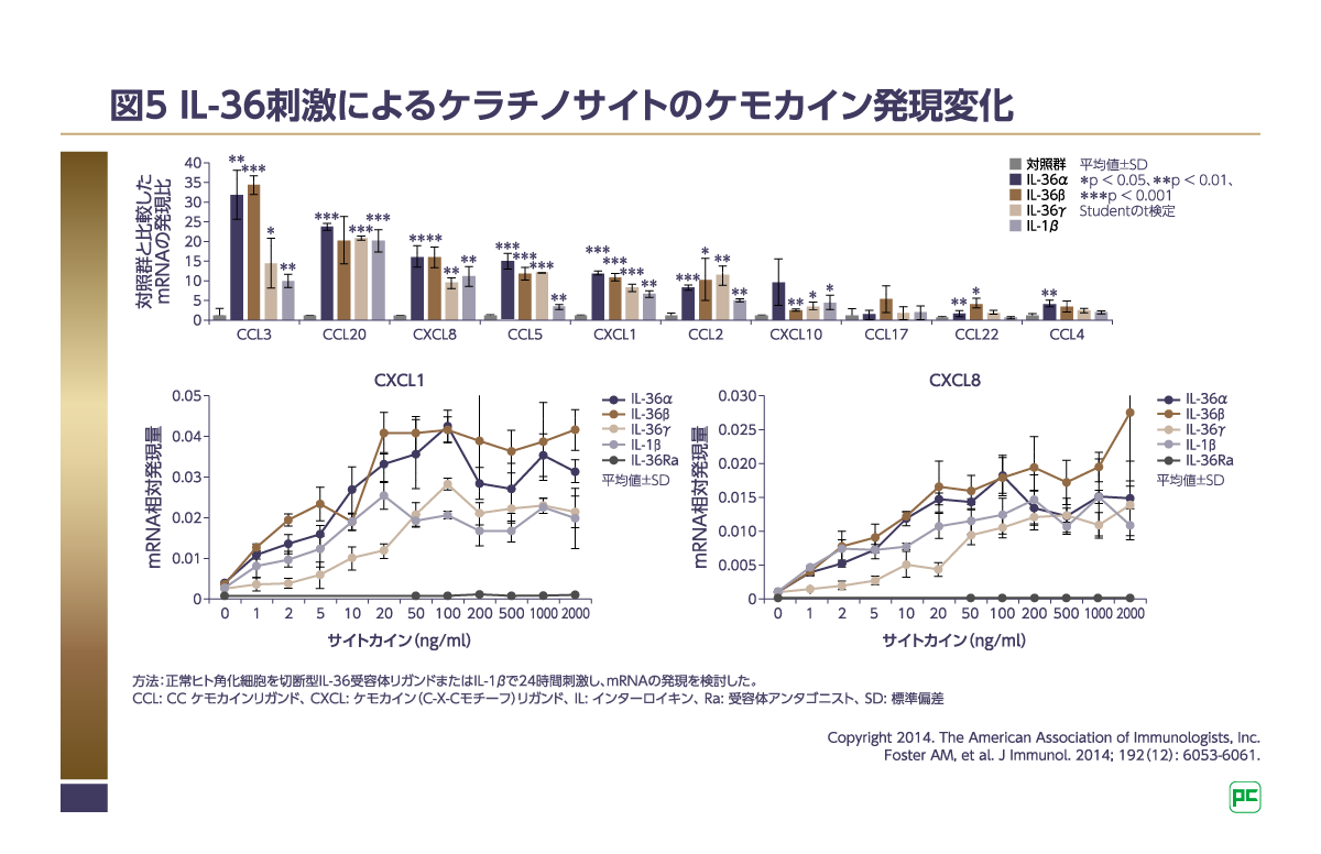 また、ヒトケラチノサイトを用いて、IL-36刺激によるケモカイン産生を検討した研究では、IL-36α、β、γを加えたケラチノサイトで白血球の遊走を誘導するCXCL1、CXCL8、CCL3、CCL5、およびCCL20の発現増加が認められました(図5)10)。さらにCXCL1、CXCL8の発現はIL-36濃度依存的に増加したことも示されています(図5)10)。