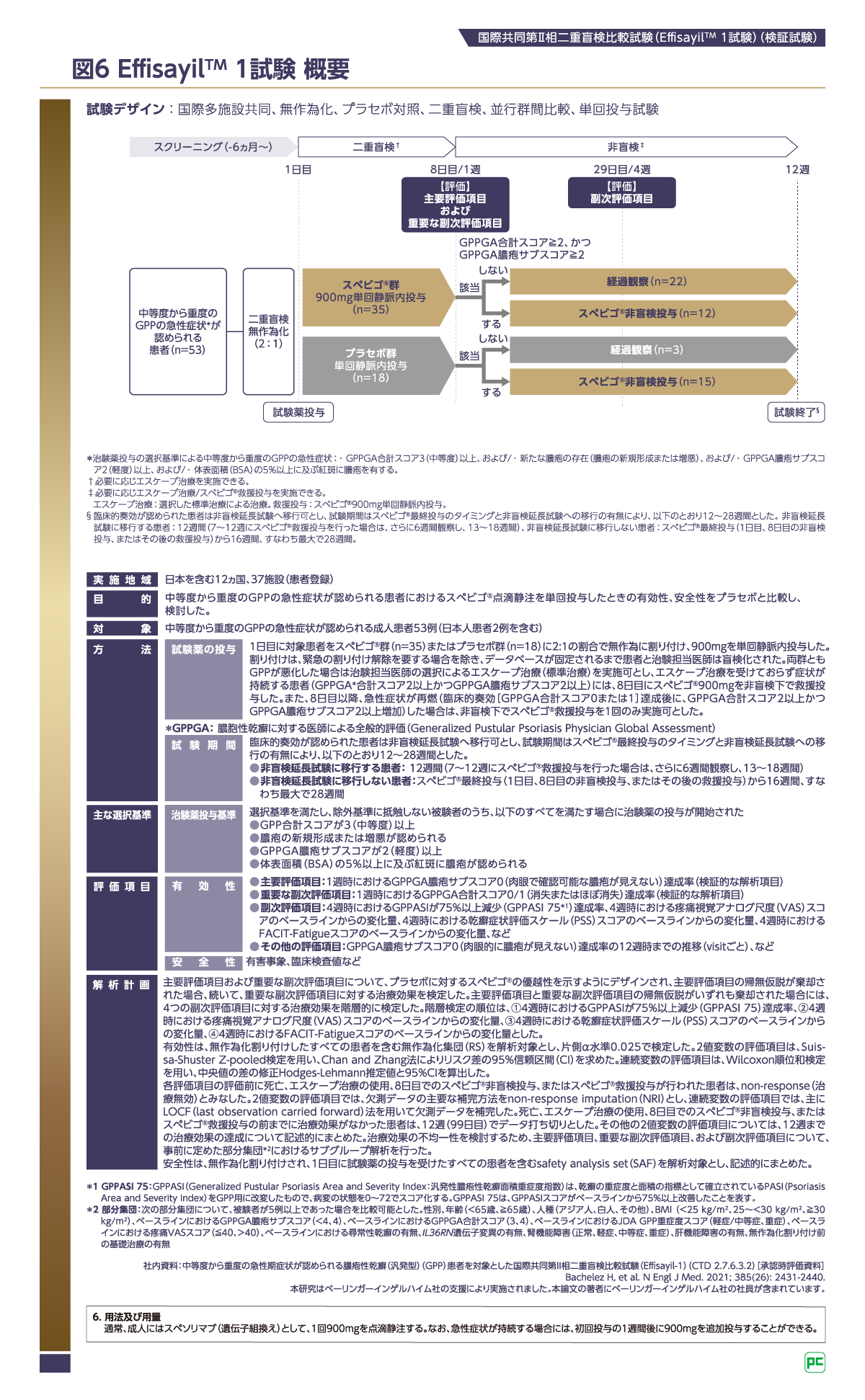 - 社内資料:中等度から重度の急性期症状が認められる膿疱性乾癬(汎発型)(GPP)患者を対象とした国際共同第Ⅱ相二重盲検比較試験(Effisayil-1試験)(CTD 2.7.6.3.2)[承認時評価資料]