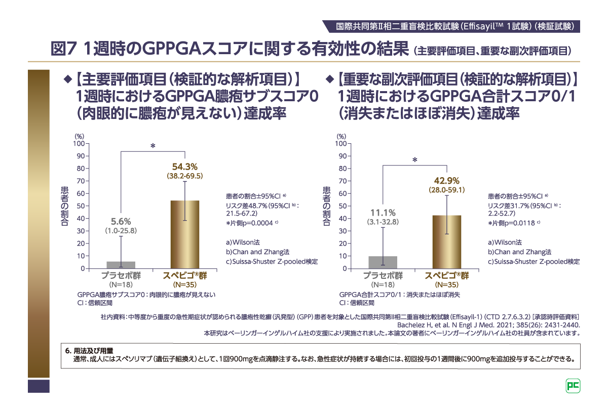 主要評価項目(1週時のGPPGA膿疱サブスコア0達成率:スペビゴ®群54.3%[19/35例]、プラセボ群5.6%[1/18例])、重要な副次評価項目(1週時のGPPGA合計スコア0/1達成率:スペビゴ®群42.9%[15/35例]、プラセボ群11.1%[2/18例])において、スペビゴ®群はプラセボ群に比べて1週時における膿疱および皮膚症状の有意な改善が認められました(それぞれ片側p=0.0004、片側p=0.0118、いずれもSuissa-Shuster Z-pooled検定、検証的な解析項目。図7)。