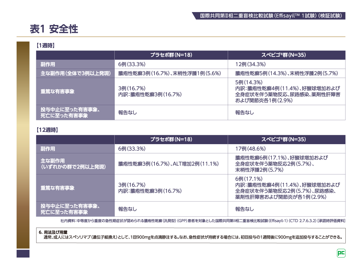 1週時までに、スペビゴ®群12例(34.3%)、プラセボ群6例(33.3%)に副作用が発現しました。主な副作用は、スペビゴ®群では膿疱性乾癬5例(14.3%)、末梢性浮腫2例(5.7%)、プラセボ群では膿疱性乾癬3例(16.7%)、末梢性浮腫1例(5.6%)でした。