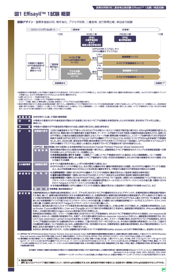 2022年9月に承認されたGPPの治療薬であるスペビゴ®は、GPPの急性症状が認められる患者を対象に行われた初めての二重盲検無作為化試験であるEffisayilᵀᴹ 1試験において有効性が検証されました2)3)。