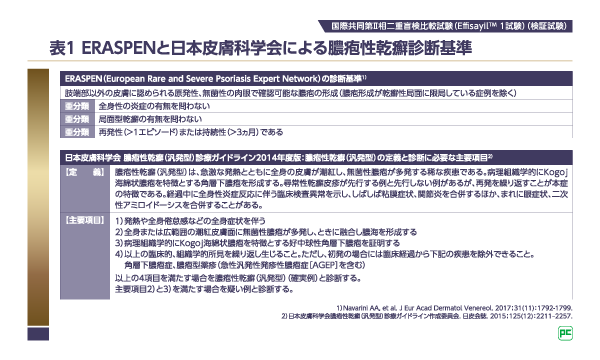 登録患者のスクリーニング時のGPPの診断は、European Rare And Severe Psoriasis Expert Network(ERASPEN、欧州の希少で重度の乾癬専門家ネットワーク)が定めるコンセンサス診断基準に基づいて行われました(表1)。ERASPENの基準では、GPPの診断にあたって全身の炎症症状の有無は問われていないため、Effisayilᵀᴹ1試験では皮膚症状によって患者登録が選択されました。なお、日本から参加した2例の患者は、ERASPEN診断基準に加えて、日本皮膚科学会「膿疱性乾癬(汎発型)診療ガイドライン」1)の診断基準に基づいて、GPPの既往の有無を確認しています(表1)。