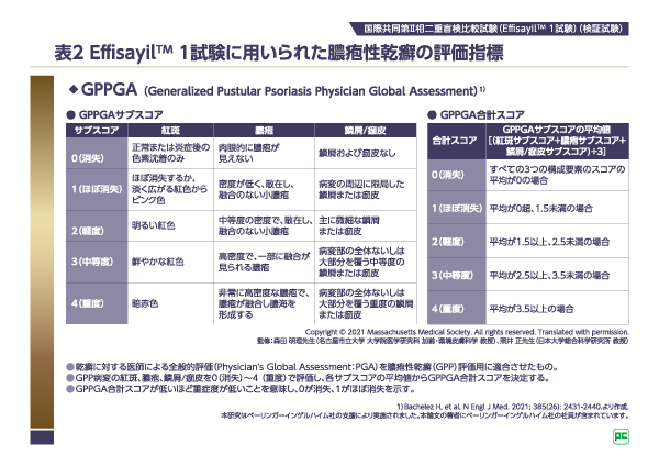 GPP患者を対象に行われた臨床試験であるEffisayilᵀᴹ1試験の特徴の1つに、重症度評価にGPPに特化した指標が用いられていることが挙げられます。