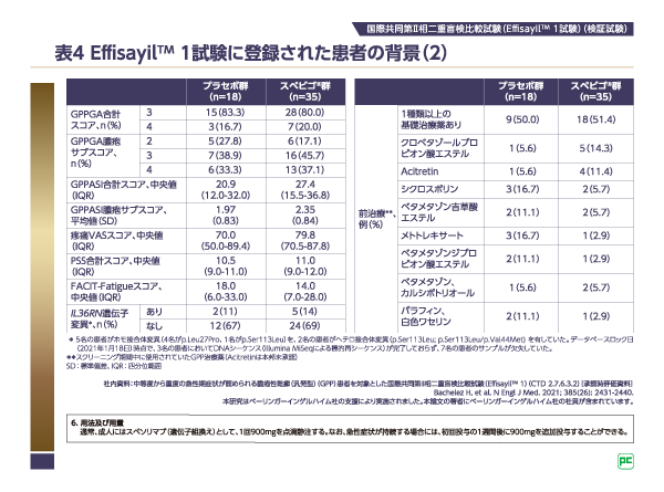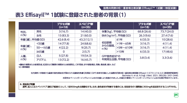 患者の選択基準(図1)に基づき、Effisayilᵀᴹ1試験のすべての登録患者は中等度から重度のGPPの急性症状が認められる患者です。Effisayilᵀᴹ1試験における中等度から重度のGPP急性症状の定義は、「GPPGA合計スコア3以上、GPPGA膿疱サブスコアが2以上、体表面積(BSA)の5%以上に及ぶ紅斑に膿疱を認める」でした。また、登録患者のGPPの罹病期間は初回診断から10年超の割合がスペビゴ®群で48.6%、プラセボ群で33.3%、GPPの急性症状の平均年間発生回数は、スペビゴ®群、プラセボ群両群ともに平均で3回を超えていることが確認されています(表3)。