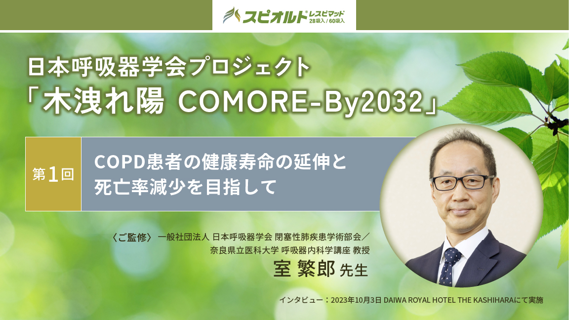本シリーズでは、全2回にわたり一般社団法人 日本呼吸器学会 閉塞性肺疾患学術部会の室 繁郎 先生より、“COPD死亡率減少”を目指す日本呼吸器学会のプロジェクト、「木洩れ陽 COMORE-By2032」についてお話しいただきます。今回は、本プロジェクトを立ち上げた背景や目的、および「健康日本21(第三次)」との関連などを伺いました。ぜひ、ご覧ください。
