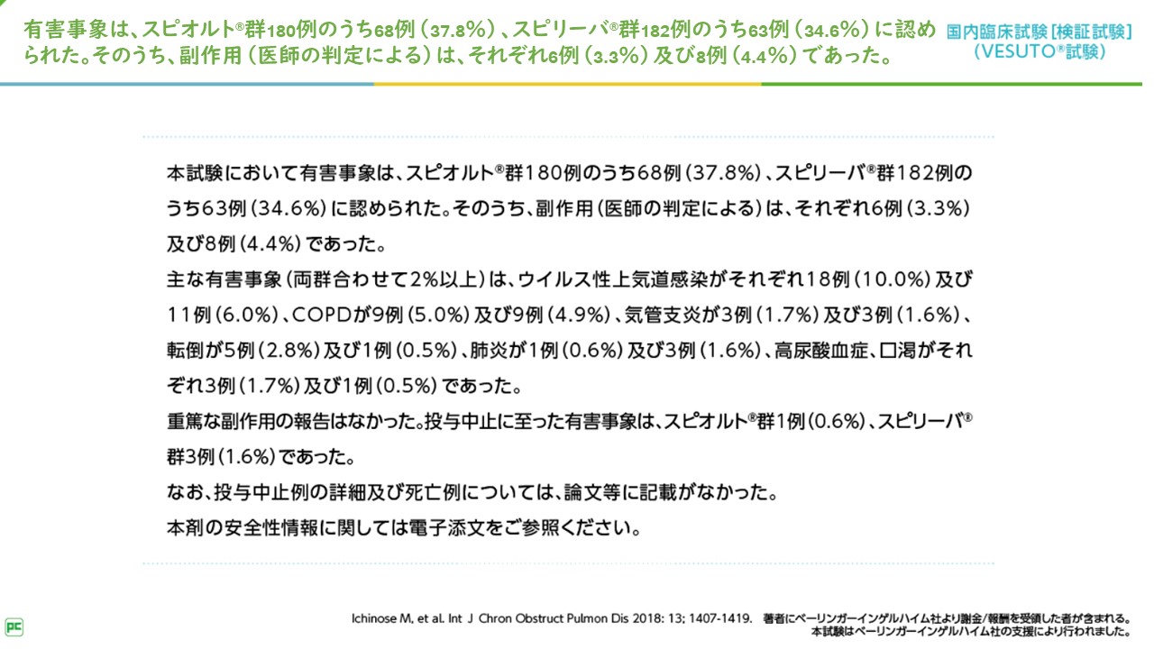 投与中止に至った有害事象は、スピオルト®群1例(0.6%)、スピリーバ®群3例(1.6%)でした。なお、投与中止例の詳細及び死亡例については、論文等に記載がありませんでした。