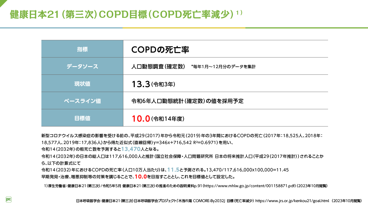 - 「健康日本21(第三次)」におけるCOPDの新たな目標は死亡率減少とされた