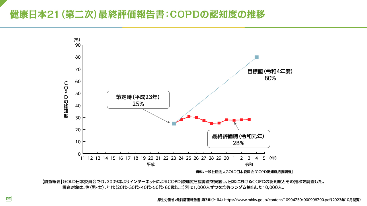 このような目的を設定した背景には、「健康⽇本21(第⼆次)」までのCOPD対策の状況も関係しています。第⼆次におけるCOPDの目標は、COPDの認知度を80%に向上させることでした。しかし、ベースライン(平成23年)の約25%から最終評価時の令和元年時点では約28%に留まっており、目標未達でした3)(図2)。