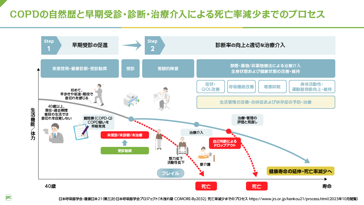 もうひとつは、COPDに対して適切な介入を行うことで健康寿命の延伸・死亡率減少につながり、一方で未診断・未治療の場合は呼吸機能や筋力、活動性の低下を来し、ひいては健康寿命の短縮につながるということをお伝えすることです。