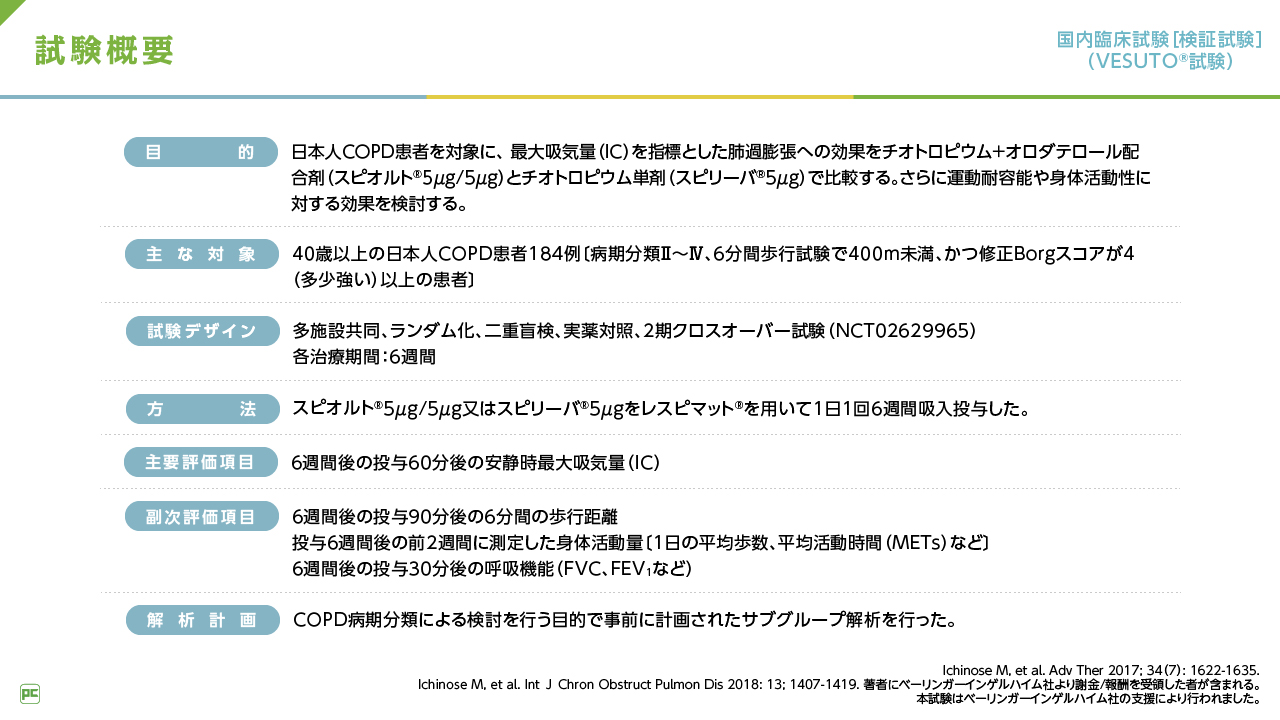 スピオルト®は、日本人COPD患者さんを対象に、呼吸機能や運動耐容能などを検討したVESUTO試験が行われています。