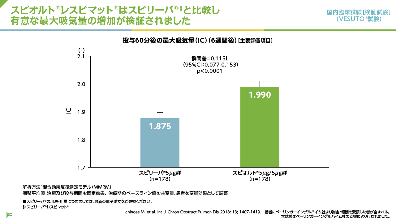 主要評価項目である6週間後における治験薬投与60分後の最大吸気量は、スピオルト®群1.990L、スピリーバ®群1.875Lであり、スピオルト®群はスピリーバ®群に対し有意な最大吸気量の増加が検証されました。