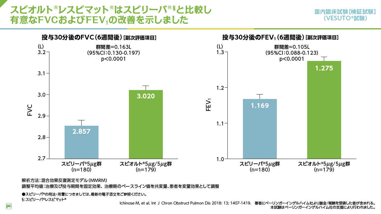 6週間後における治験薬投与30分後のFVCは、群間差0.163L、投与30分後のFEV1は群間差0.105Lと、スピオルト®群はスピリーバ®群に対し有意なFVCおよびFEV1の改善を示しました。