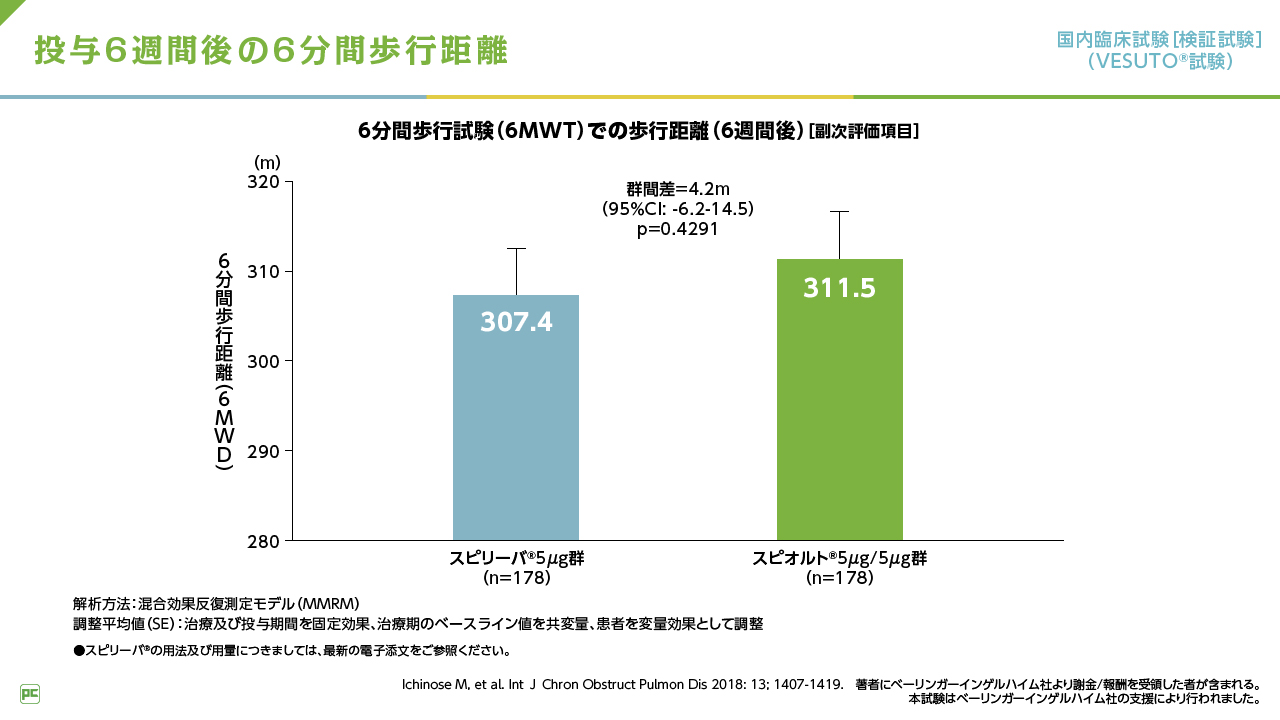 運動耐容能の指標である6分間歩行距離は、両群間で有意差は認められなかったものの、スピオルト®群で311.5m、スピリーバ®群で307.4mでした。