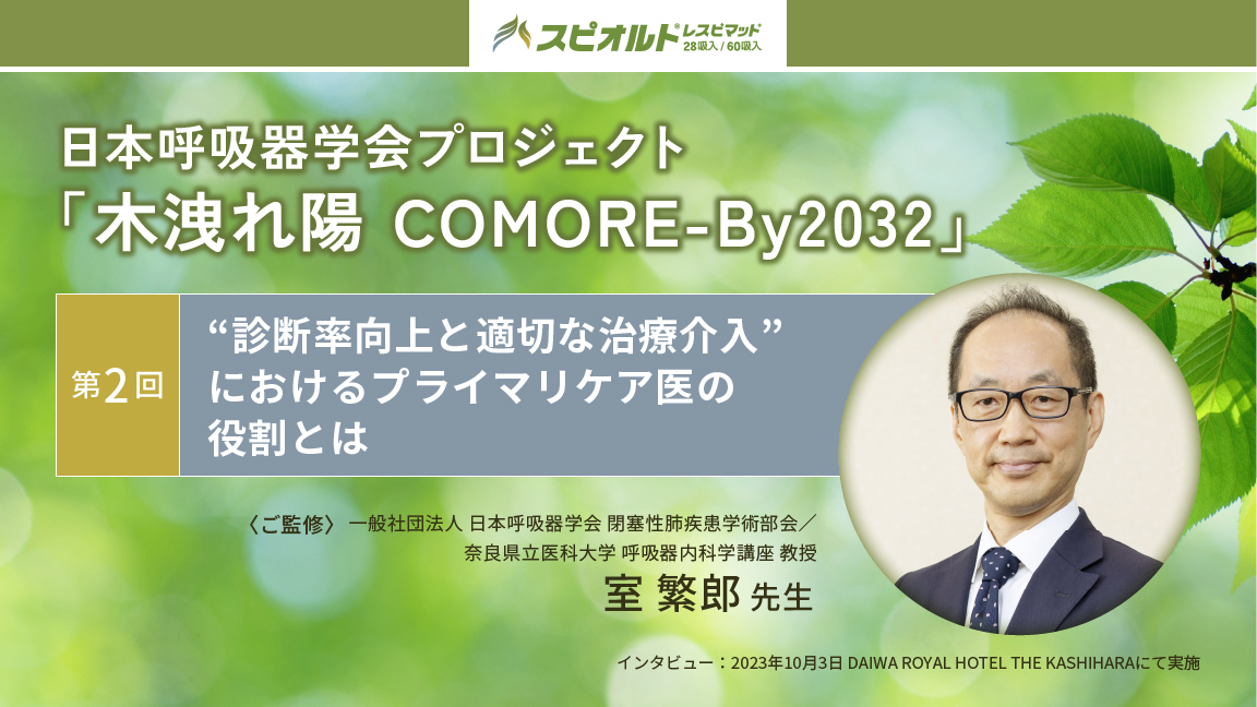 本シリーズでは、全2回にわたり一般社団法人 日本呼吸器学会 閉塞性肺疾患学術部会の室 繁郎 先生より、“COPD死亡率減少”を目指す日本呼吸器学会のプロジェクト、「木洩れ陽 COMORE-By2032」についてお話しいただきます。今回は、本プロジェクトの概要を踏まえたCOPD診断率向上と適切な治療介入、地域専門医や多職種との連携について伺いました。ぜひ、ご覧ください。