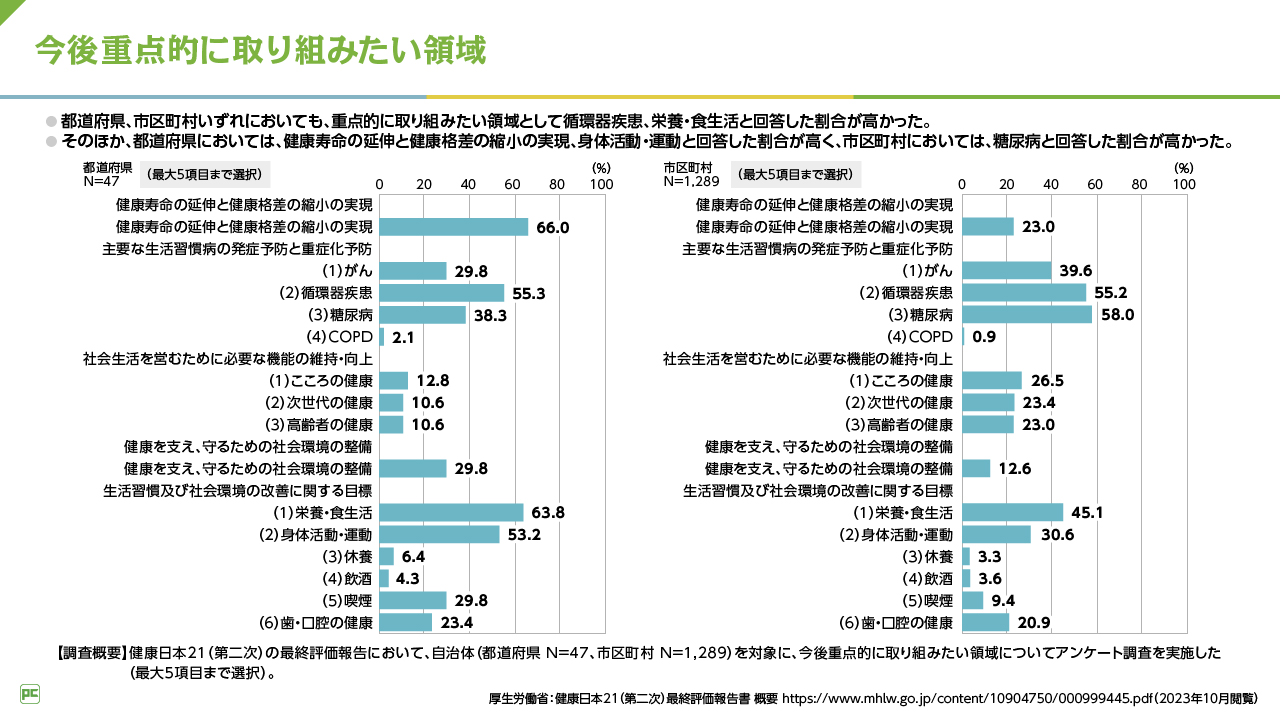 実際、第二次におけるCOPDの認知度向上という目標は未達でした7)。さらに、第二次の最終評価報告書にて、自治体を対象に今後重点的に取り組みたい領域についてアンケート調査を行った結果が掲載されています。ご覧のとおり、がん、循環器疾患、糖尿病ではそれぞれ3~6割の自治体が取り組みたいと回答していたのに対し、COPDに取り組みたいと回答した自治体は都道府県で2.1%、市区町村で0.9%でした(図2)。