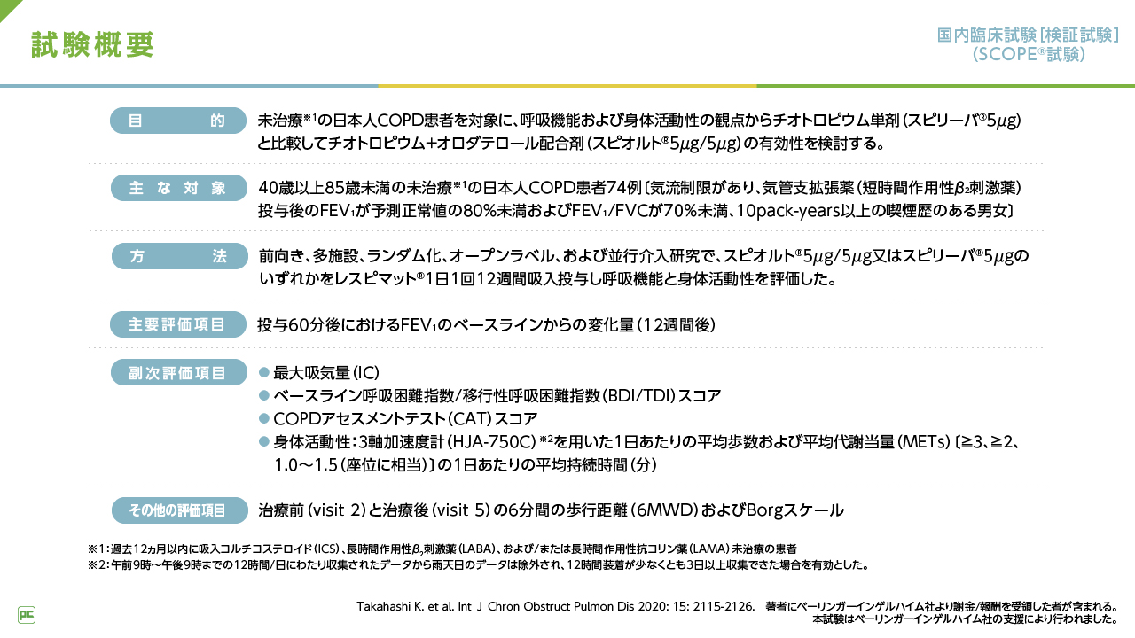 スピオルト®は、未治療の日本人COPD患者さんを対象に、呼吸機能と身体活動性の観点から有効性を評価したSCOPE®試験が行われています。
