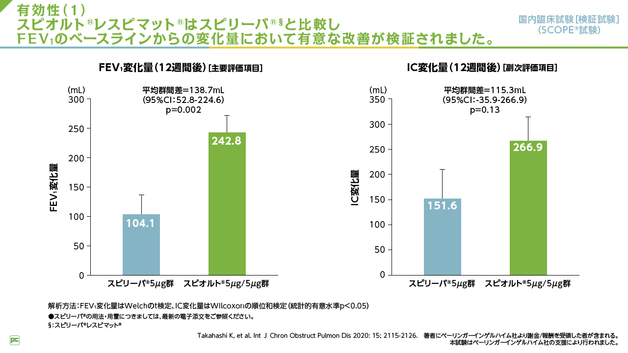 主要評価項目である12週間後のFEV1のベースラインからの変化量は、スピオルト®群242.8mL、スピリーバ®群104.1mLであり、スピオルト®群で有意な改善が検証されました。