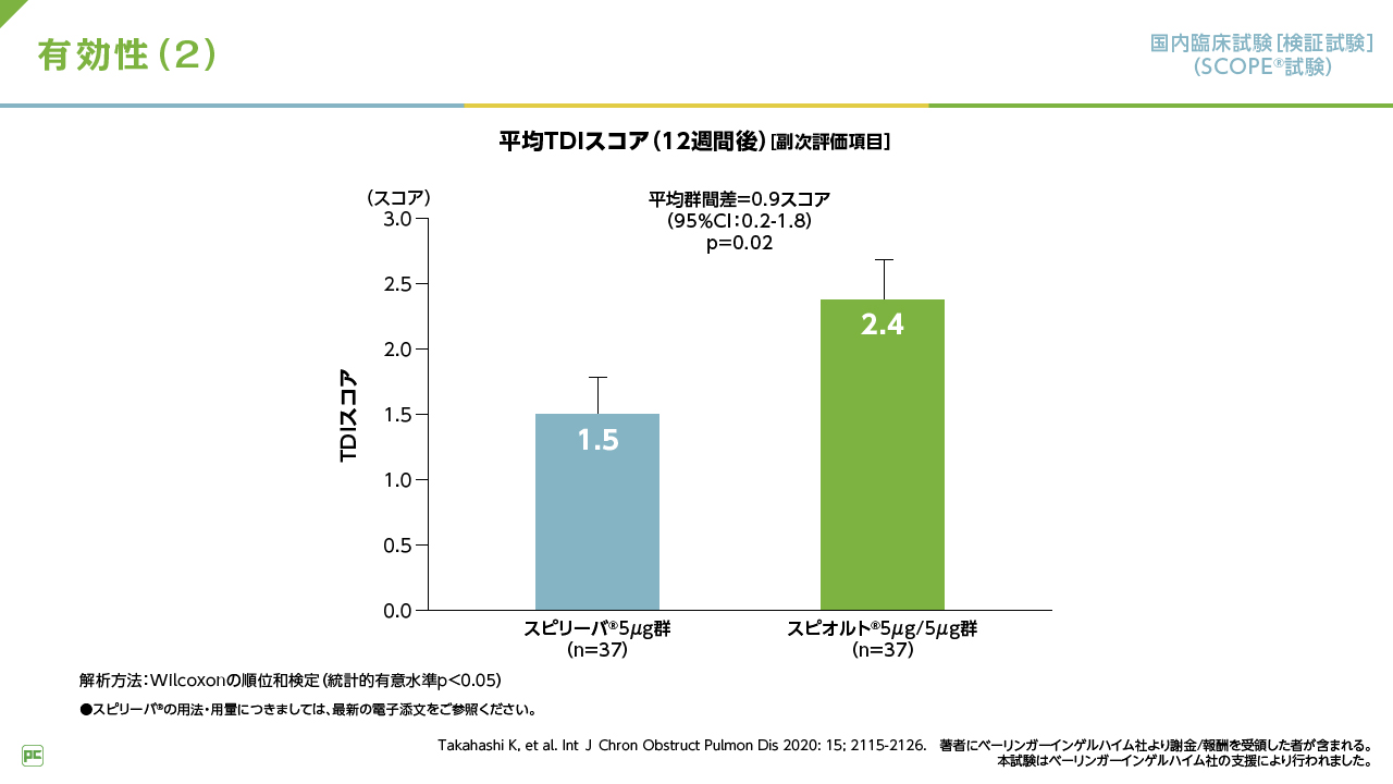 また、息切れの指標であるTDIスコアは、12週間後においてスピオルト®群2.4、スピリーバ®群1.5であり、スピオルト®群で有意な改善を示しました。