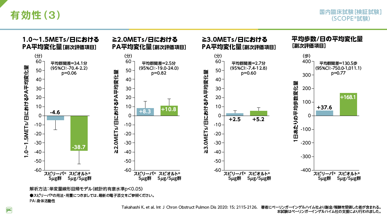 近年、COPDの身体活動性においてセデンタリー行動(臥位や座位などの静的な行動)が注目されています。本試験において、セデンタリー行動に相当する1.0~1.5METsの1日における平均変化量は、スピリーバ®群-4.6分に対し、スピオルト®群-38.7分であり、平均群間差は34.1分でした。一方、2.0METs/日以上、3.0METs/日以上の平均変化量の平均群間差は、それぞれ2.5分、2.7分でした。