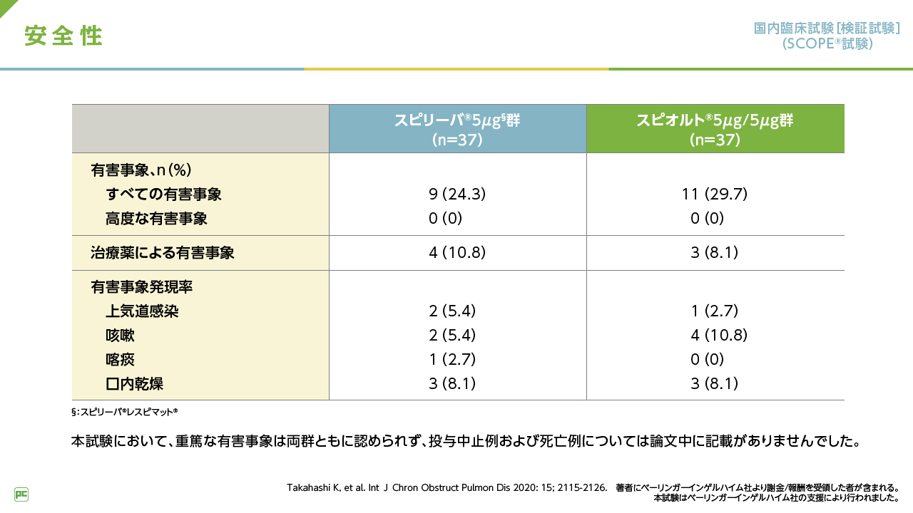 主なものは上気道感染2例(5.4%)、1例(2.7%)、咳嗽2例(5.4%)、4例(10.8%)などでした。治療薬による有害事象は4例(10.8%)、3例(8.1%)に発現しました。