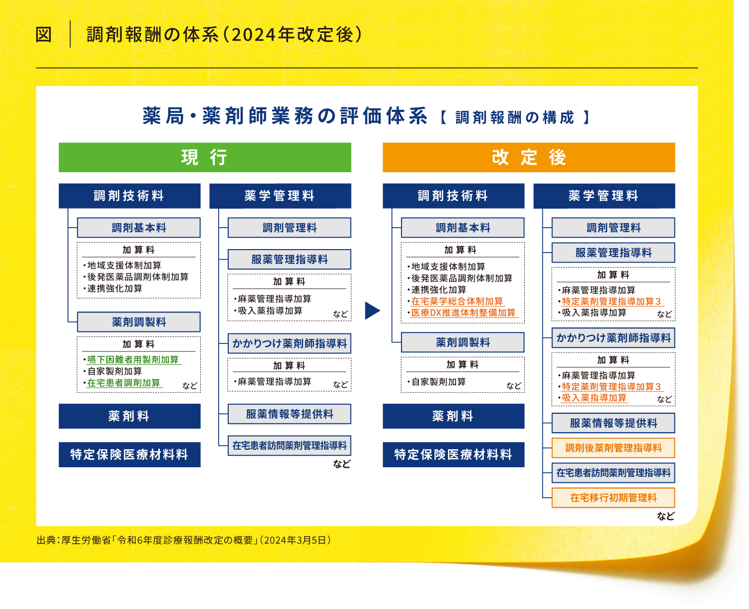 調剤基本料は、薬剤師の処遇改善に加え、地域の医薬品供給拠点としての役割の確立や地域医療への貢献の促進を目的に、基本料1、2、3-イ、3-ロ、3-ハをいずれも3点ずつ引き上げます。調剤基本料に関連する加算も、地域医療に取り組み、かかりつけ薬局・薬剤師としての機能を推進する方向で見直され、地域支援体制加算で夜間・休日等の対応やかかりつけ薬剤師指導料等の実績など地域医療に貢献する体制の実績がより明確に定められました。