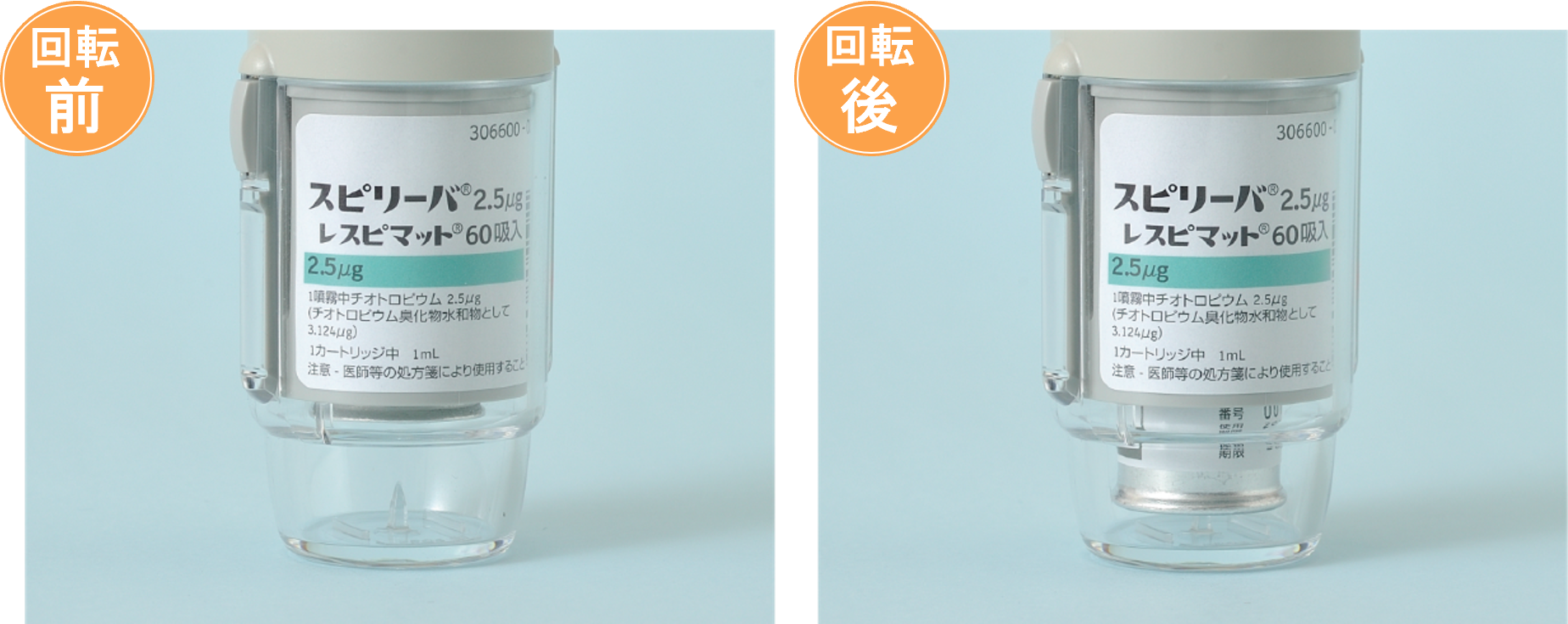 A: キャップを開けた状態で回転させると、微量の薬液が噴霧されることがあります。必ずキャップを閉めた状態で回転させてください。誤噴射を防ぐために、レスピマット®はキャップを閉めた状態では噴霧ボタンがキャップに覆われて押せない構造になっています。