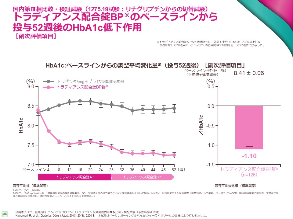 その結果、投与開始時から投与52週目までのHbA1cはご覧のように推移し、トラディアンス配合錠BPへ増量した群の投与52週後のHbA1cのベースラインからの変化量は-1.10%でした。