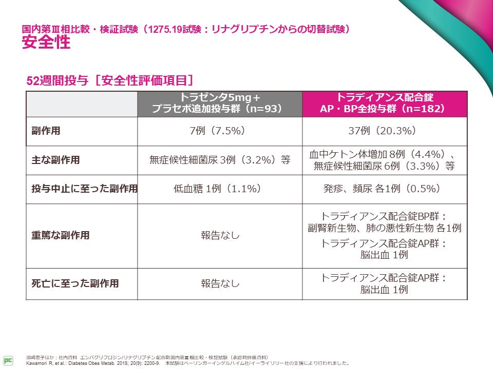 投与中止に至った副作用として、トラディアンス配合錠AP群では発疹および頻尿いずれも0.5%(1/182例)、トラゼンタ5mg+プラセボ追加投与群では低血糖1.1%(1/93例)が認められました。