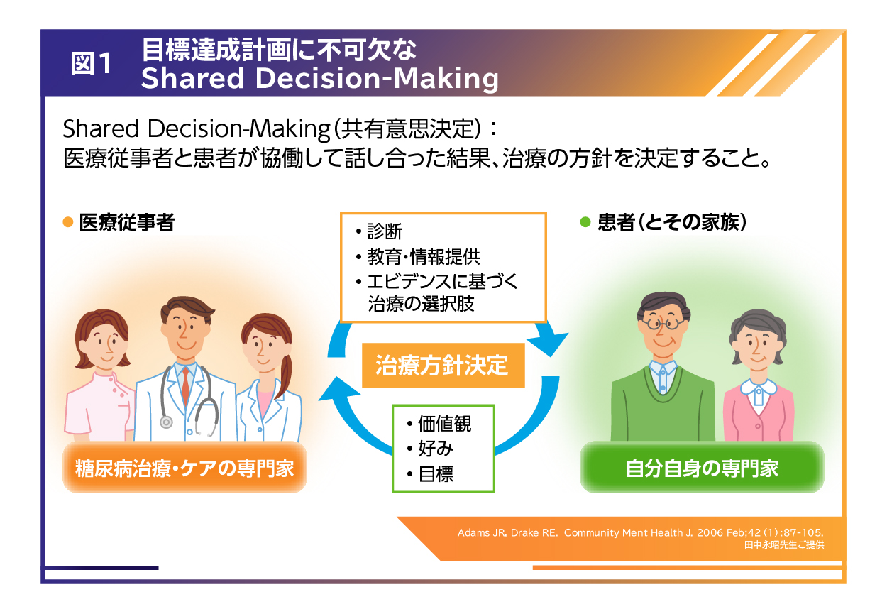 このような背景から近年では、「療養指導」という一方向な表現を、「目標達成計画」という患者さん中心の表現に改めようという考えが注目を集めています。「目標達成計画」とは、医療者が患者さんと目標をともに考えて設定し、その目標を達成するために話し合うことであり、この目標達成計画の実践には共同意思決定(shared decision making;SDM)のプロセスが欠かせません(図1)。
