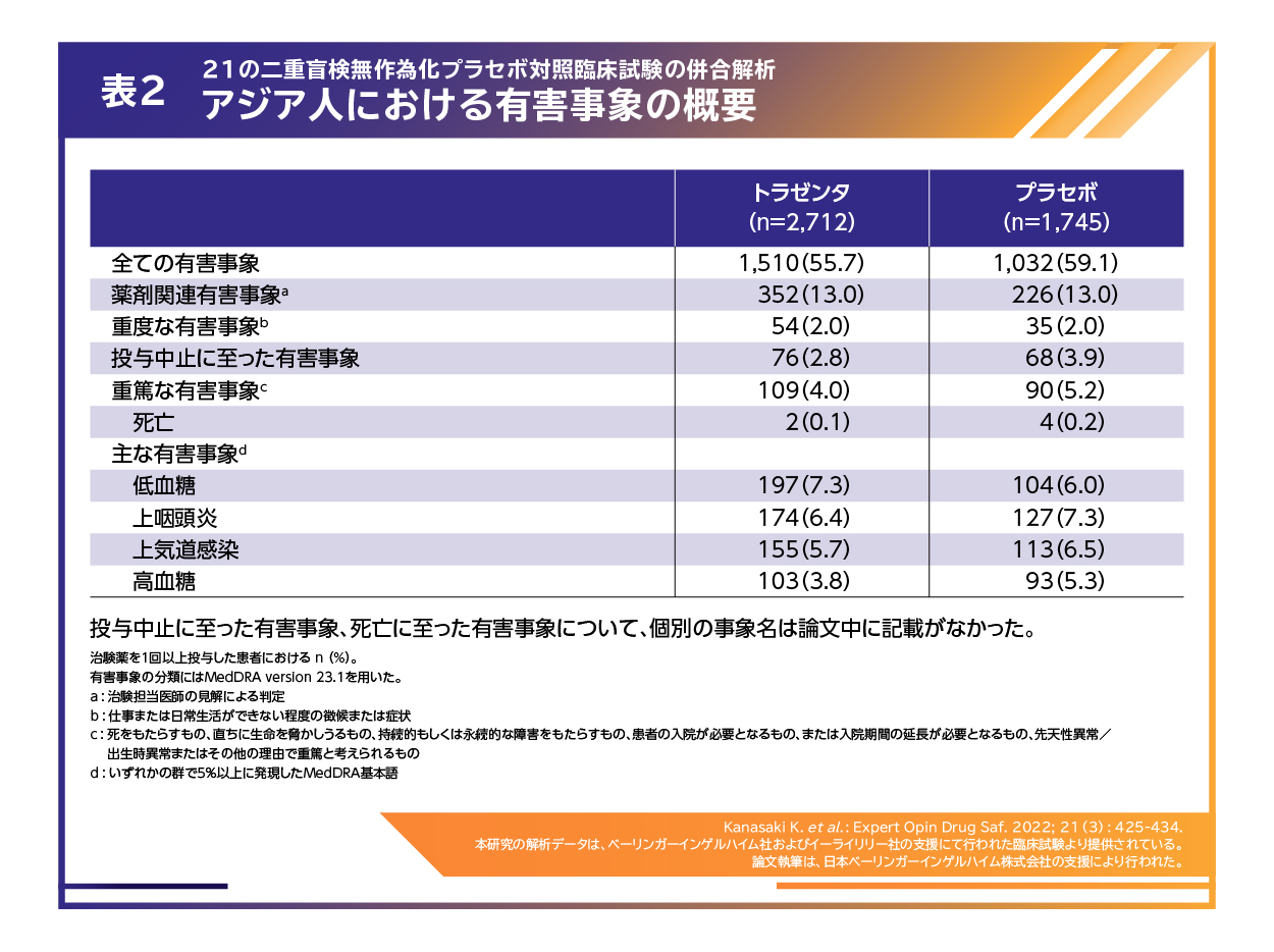 主な有害事象はトラゼンタ®群で低血糖197例(7.3%)、上咽頭炎174例(6.4%)、上気道感染155例(5.7%)、高血糖103例(3.8%)など、プラセボ群で上咽頭炎127例(7.3%)、上気道感染113例(6.5%)、低血糖104例(6.0%)、高血糖93例(5.3%)などでした。