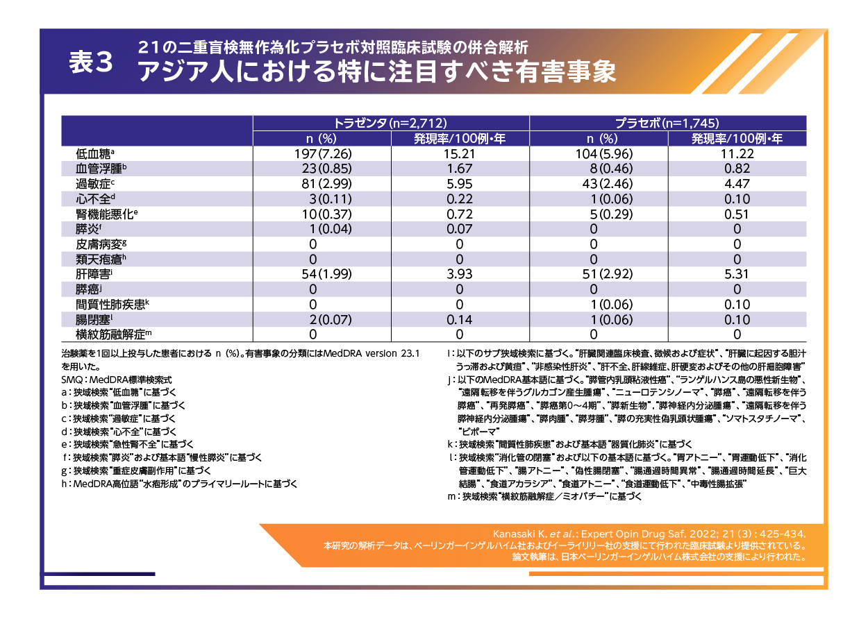 特に注目すべき有害事象は表3にお示しする通りで、血管浮腫がトラゼンタ®群23例(0.85%)、プラセボ群8例(0.46%)、過敏症がそれぞれ81例(2.99%)、43例(2.46%)、心不全は3例(0.11%)、1例(0.06%)でした。