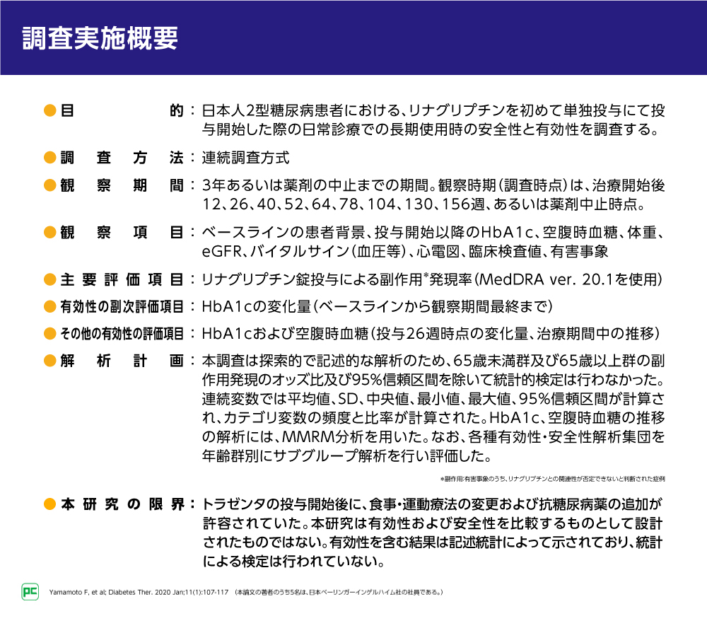 日本人2型糖尿病患者さんで、初めてトラゼンタを単独療法として服用する患者さんを対象に、トラゼンタの長期安全性・有効性を調査する観察研究が行われました。