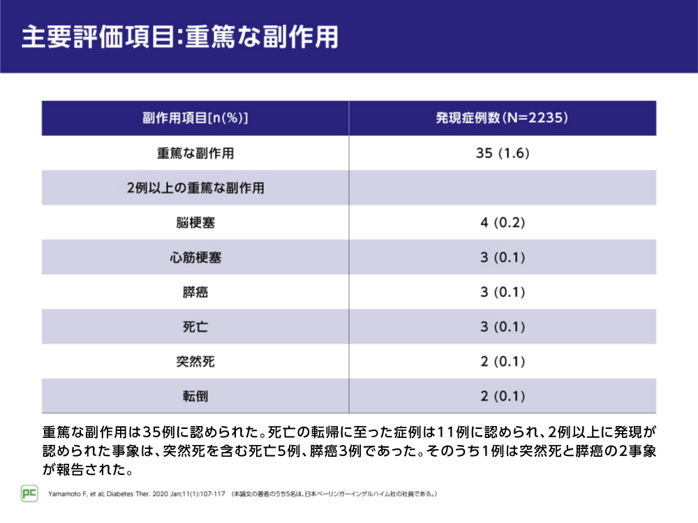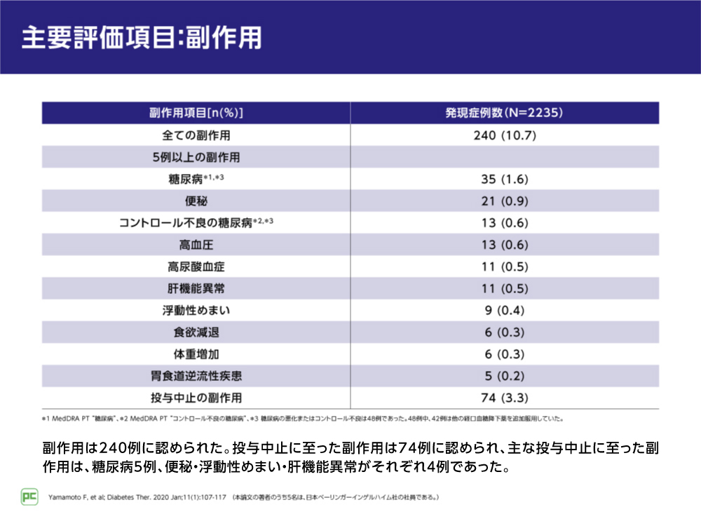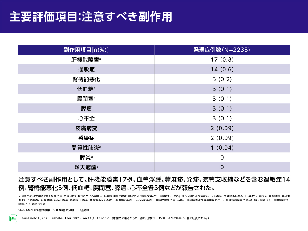 注目すべき副作用については、肝機能障害は17例(0.8%)、血管浮腫、蕁麻疹、発疹、気管支収縮などを含む過敏症は14例(0.6%)、腎機能悪化は5例(0.2%)、低血糖、腸閉塞、膵癌、心不全は各3例(各0.1%)などでした。