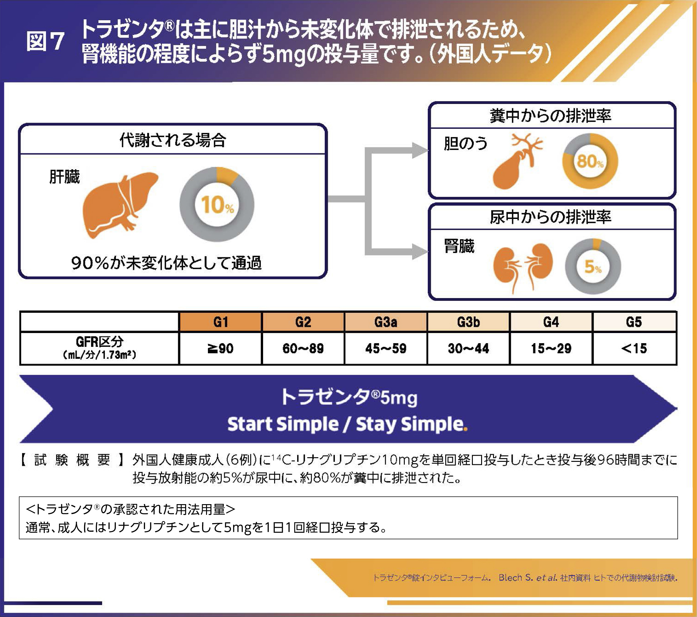 さらに、日本人2型糖尿病のある方では、罹病期間が長くなるほど糖尿病性腎症の合併率が高まると報告されていますが、トラゼンタ®は主に胆汁から未変化体で排泄されるため、腎機能の程度によらず1日1回5mgの投与量で治療を行うことが可能です(図7)9)10)11)。