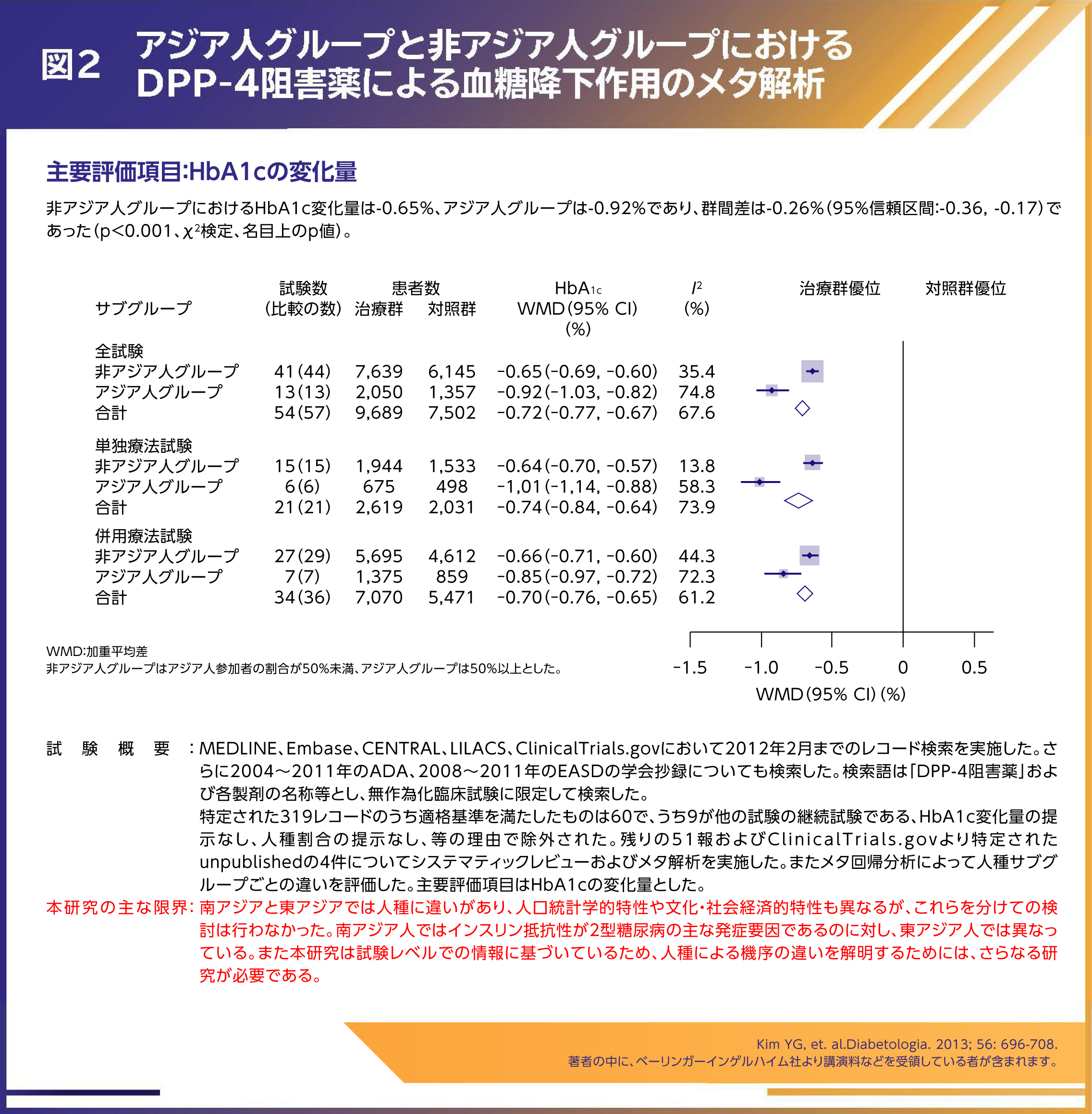 2型糖尿病患のある方を対象に、アジア人グループと非アジア人グループでDPP-4阻害薬の血糖降下作用を検討したメタ解析では、アジア人2型糖尿病のある方は、非アジア人2型糖尿病のある方と比べて、DPP-4阻害薬による血糖降下作用が高いことが示されています(HbA1c変化量の加重平均差[WMD]:アジア人-0.92%、非アジア人-0.65%、群間差-0.26%[95%信頼区間:-0.36, -0.17]、p<0.001[χ2検定]、名目上のp値)(図2)4)。